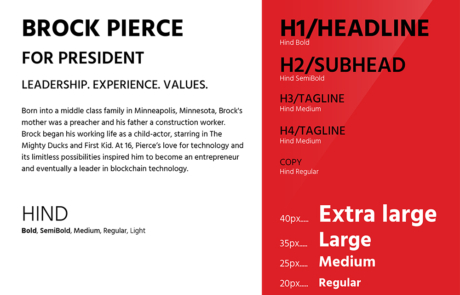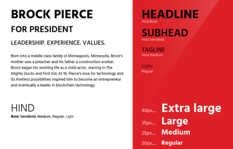 The Brock team commissioned us to develop branding for their 2020 presidential campaign. We created several conceptual logos and a comprehensive branding guideline handbook for their reference. In addition, we produced five billboards for display in Times Square, New York City.